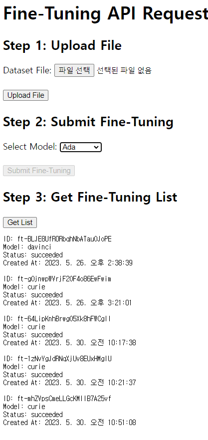 A. 아래는 업로드 파일, 파인튜닝 제출 및 파인튜닝 리스트 가져오기 기능이 통합된 HTML 코드입니다. 코드 내에 주석으로 단계별 설명을 추가하였습니다.