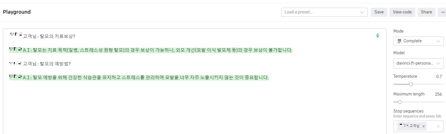 다시 playground로 가서 Model을 방금 만든 모델로 선택하고, temperature는 0.7로 설정하고, stop sequences를 프롬프트의 시작으로 설정했다.